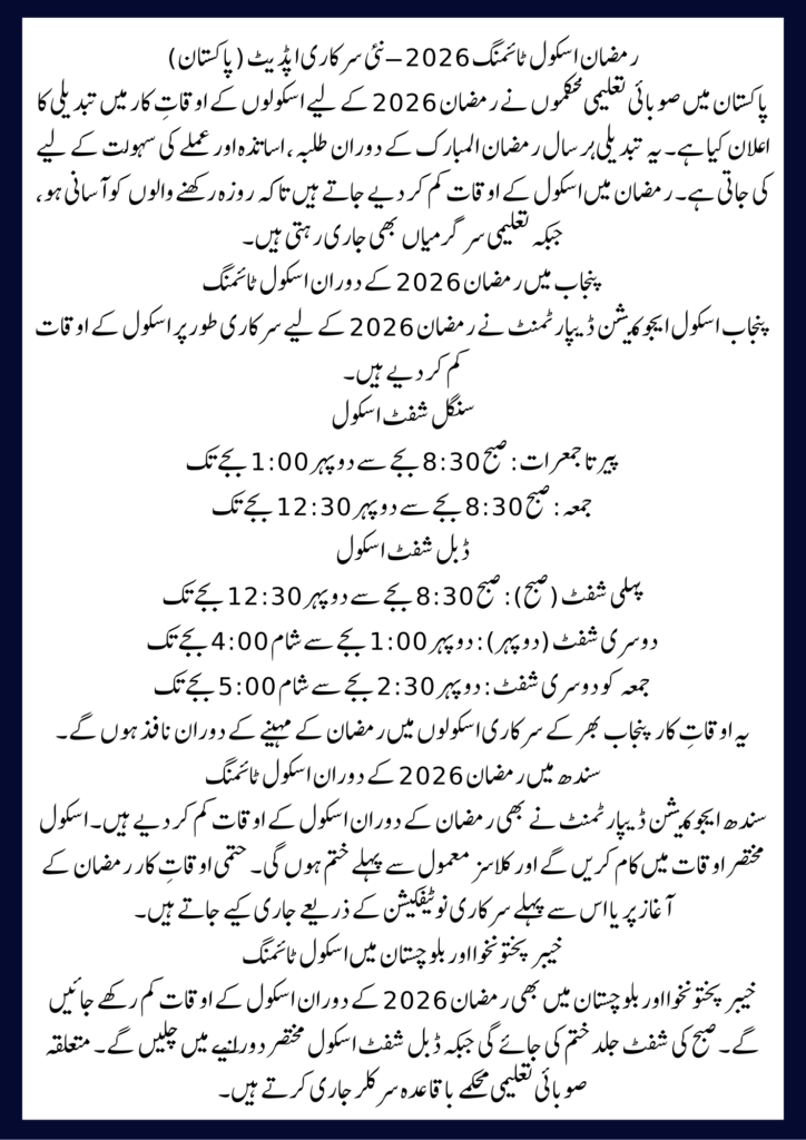 The Sindh Education Department has also reduced school hours for Ramzan. Schools operate on shortened schedules, with classes ending earlier than usual. Final exact timings are communicated through official notifications issued before or at the start of Ramzan.